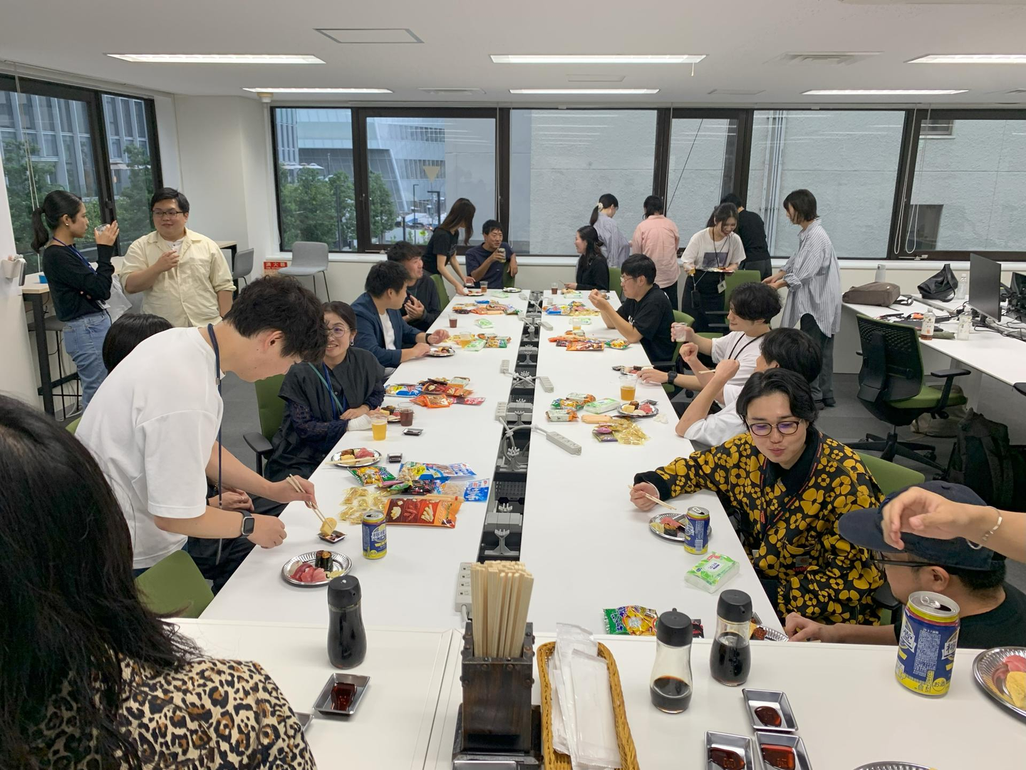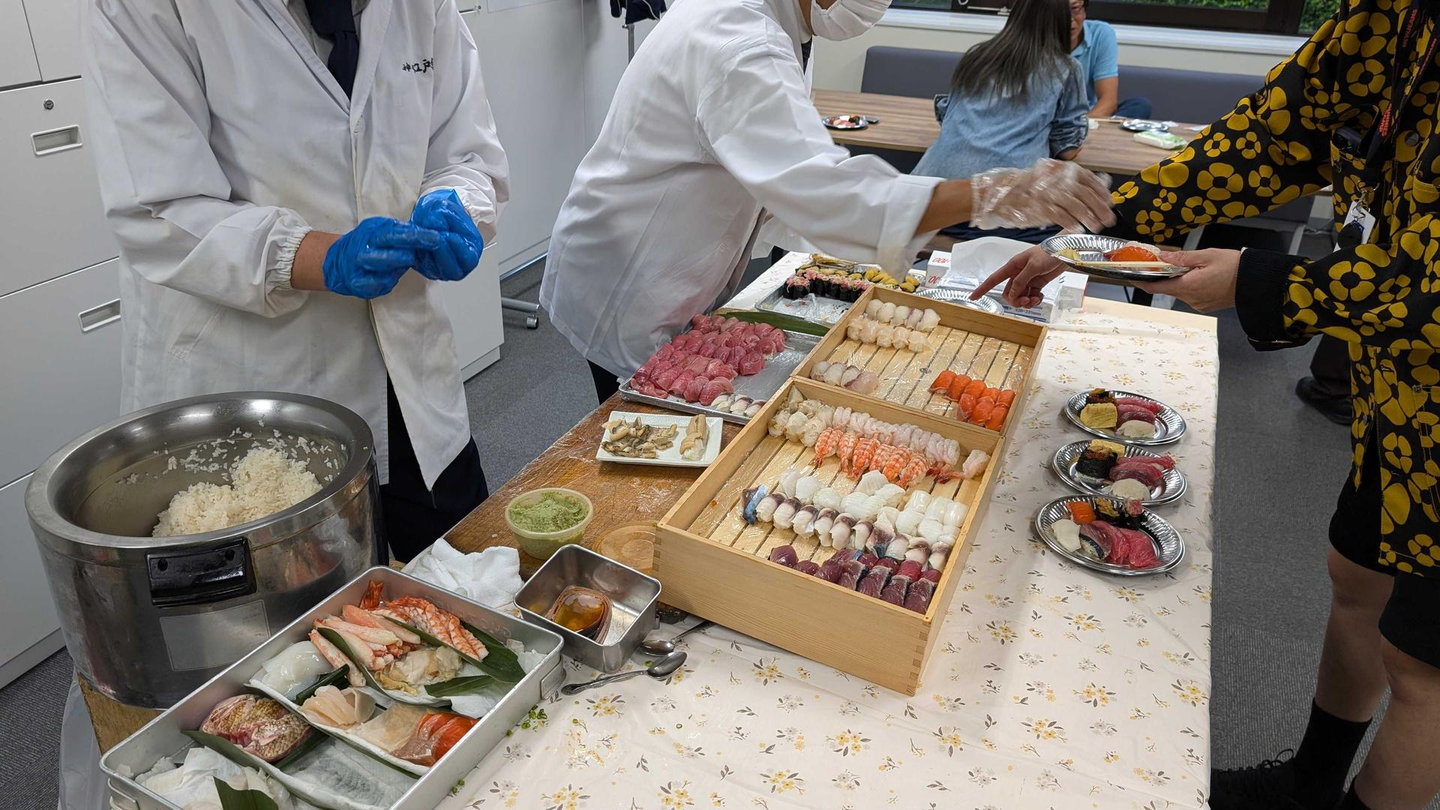 今回の目玉は、なんとその場で握ってくれる本格的なお寿司。職人さんがひとつひとつ丁寧に握ってくれたお寿司を堪能できました。握りたてのお寿司を味わいながら、みんなの笑顔が溢れる時間となりました。お寿司は大盛況で、常に大行列!待つ時間さえ楽しみの一つになるほど、賑やかで活気あふれる懇親会となりました。