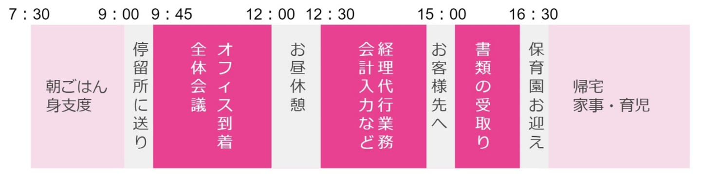 毎日、6時間を勤務時間の目安として、だいたい9:30から16:00の間で勤務しています。ただ、子どものケアなどに時間を取られて業務が終わらない日もあります。その分は、勤務可能時間帯の5:00から22:00の間で細切れの時間を見つけて、業務を完遂するようにしています。または、土曜日にまとめて仕事をしていますね。