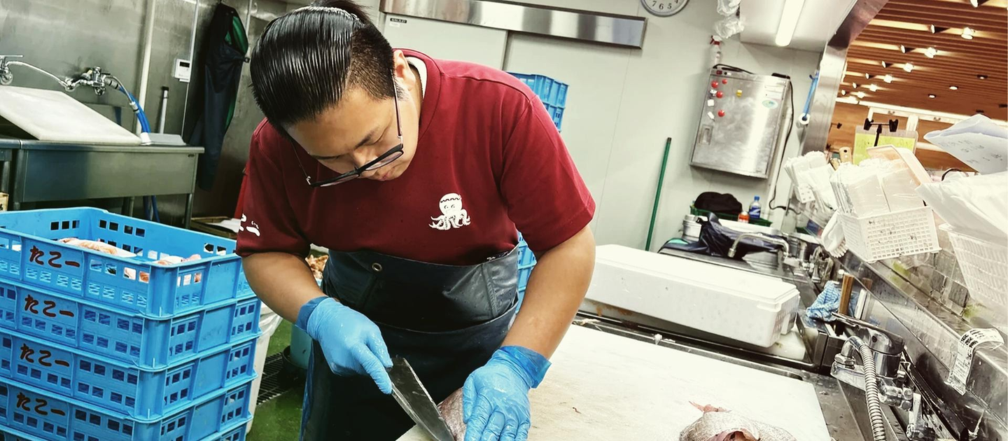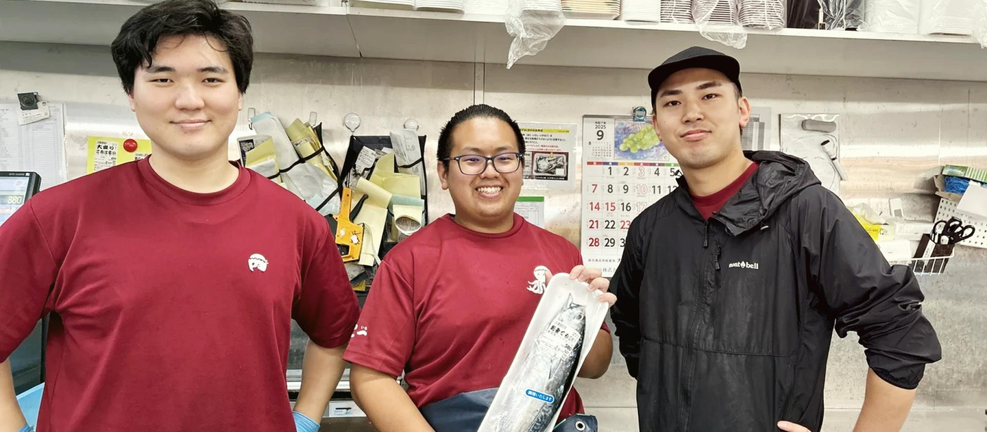 2025年4月に入社し、八尾店に配属されました。仕事内容は荷下ろし、魚の盛り付けやパック詰めが中心ですが、時間があれば必ず魚を触る練習をさせてもらっています。