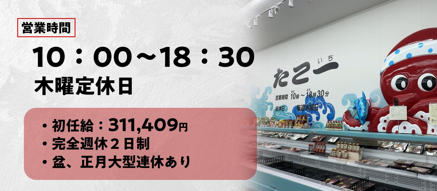 スーパーって「夜遅くまで仕事やろな〜」ってイメージ持ってたんですけど、たこ一は18時半で閉店で、22時まで働くなんてほぼないです。