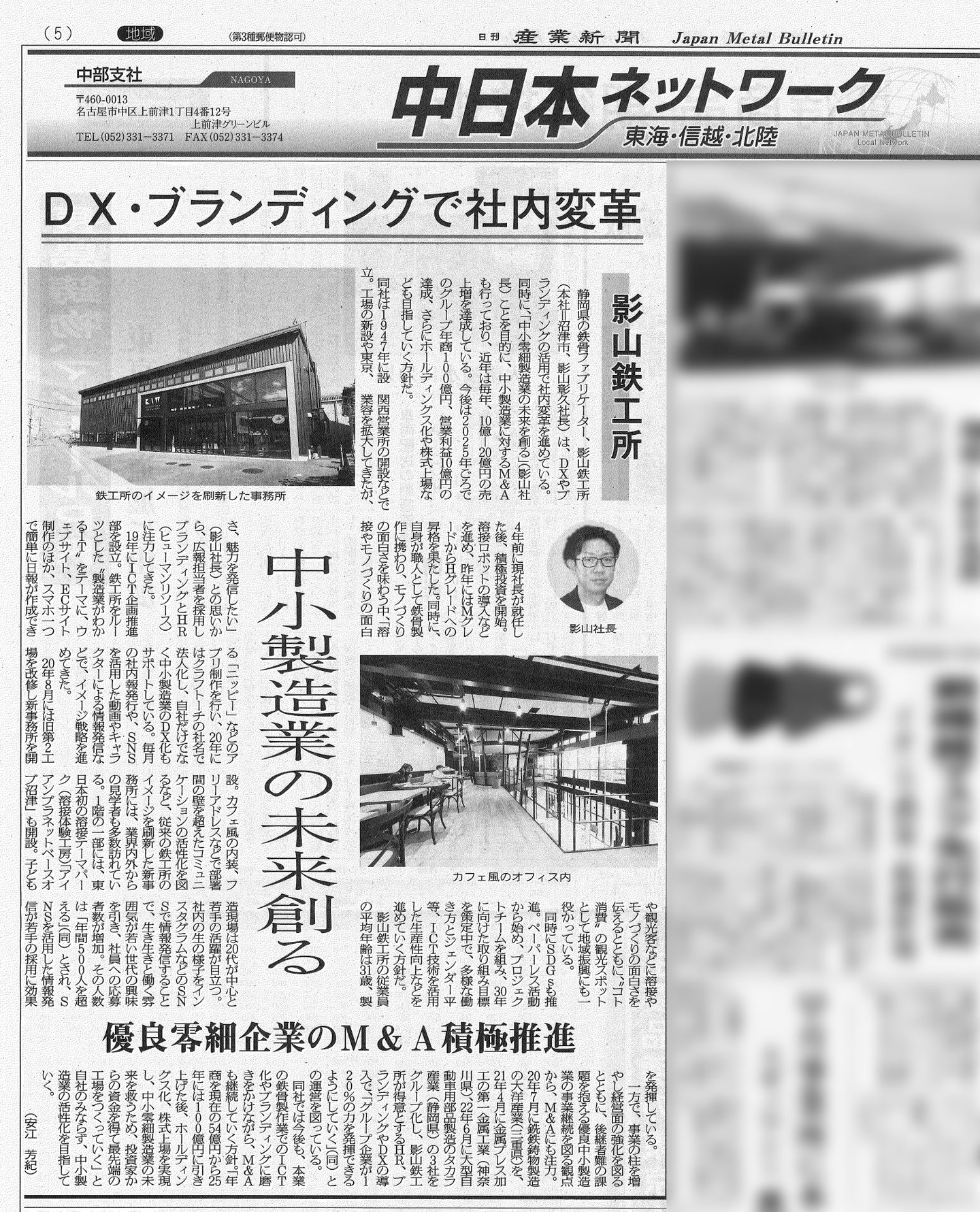 株式会社影山鉄工所Followhttps://kageyama-co.jp静岡県FollowHomeAbout usMembersStoriesJob postings 8/29(月)産業新聞 掲載 山崎 智美 HRブランディング部 on 2022-09-07 Photo by Bank Phrom on Unsplash 産業新聞 掲載のお知らせ2022年8月29日発行の(中部版) 産業新聞 5面 中日本ネットワークのコーナーにて、弊社が掲載されました。M&Aや、DX・ブランディングへの取り組みなど幅広くご紹介いただきました。 株式会社影山鉄工所's job postings 8/29(月)産業新聞 掲載 山崎 智美 株式会社影山鉄工所 / HRブランディング部 ネットワーク ブランディング メディア掲載 新聞掲載 新聞記事 Share