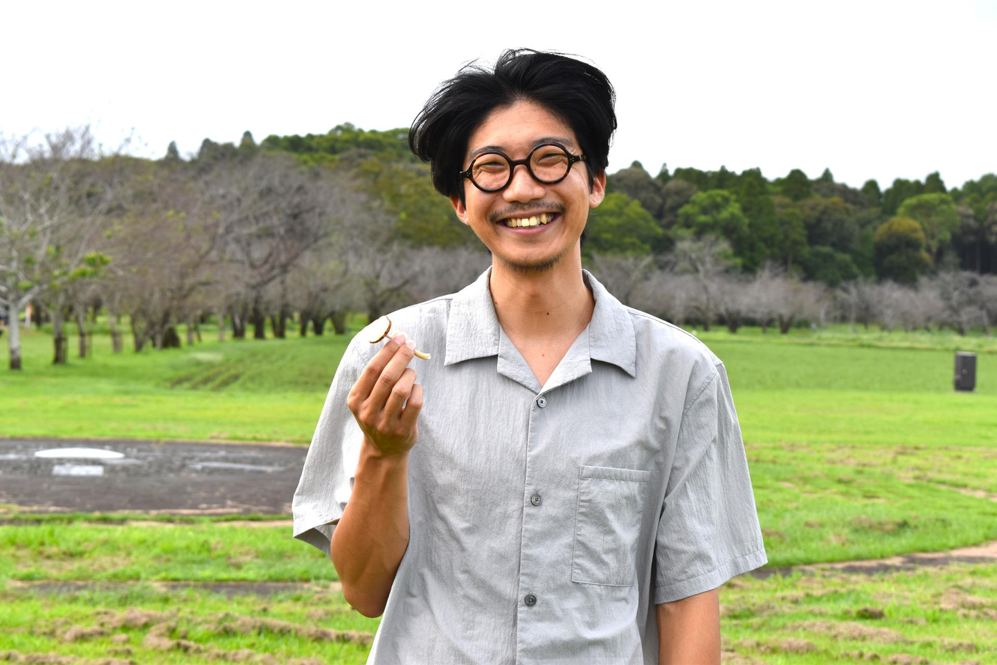 ▲風に吹かれ、西都原に生えていた謎キノコを手にして笑っている僕。これが一番いい表情だった。