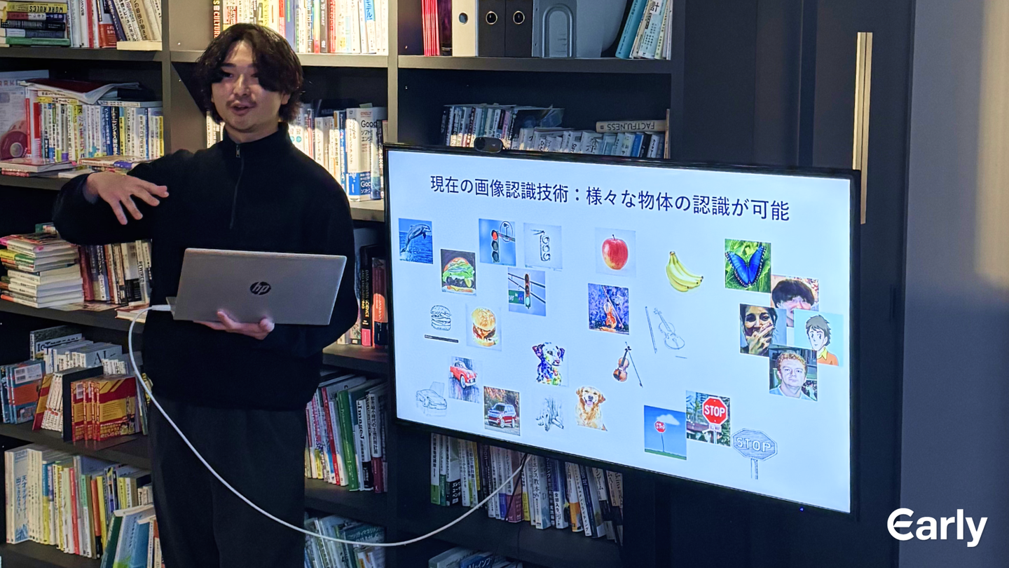 ▼卒業前最後の社内交流イベントで、大学院での研究・アーリーでの取り組みについて発表していただきました!