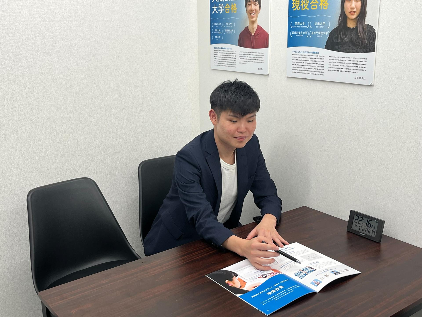 14時半に出社し、生徒が来るまでの間に清掃や集客活動のブログ作成などを行います。事務手続きなどもこの時間に済ませておくことが多いです。徐々にスタッフが出勤して、18時以降は生徒や保護者対応。スタッフ研修なども随時行なっています。