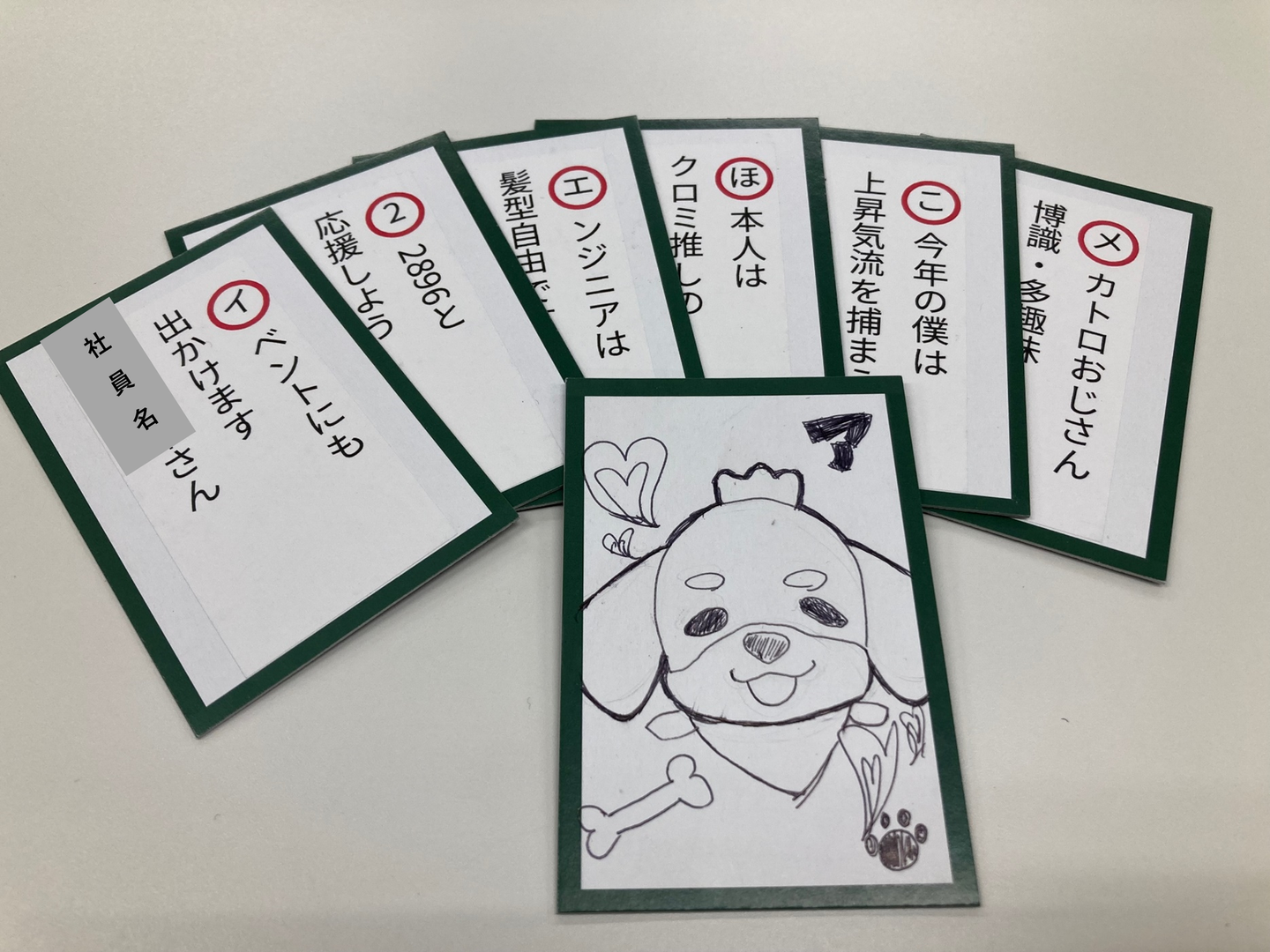 そんな社員のコミュニケーション不足を解消させるために、今回社員の特徴をネタにした”かるた”を作成し、社員みんなで大会を行いました!