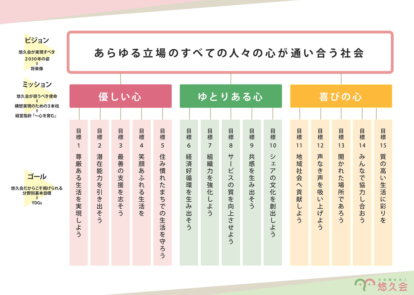 YDGsでは「あらゆる立場のすべての人々が心通い合う社会」を実現するために3つの柱「優しい心」「ゆとりある心」「喜びの心」と15の目標を設定しています。