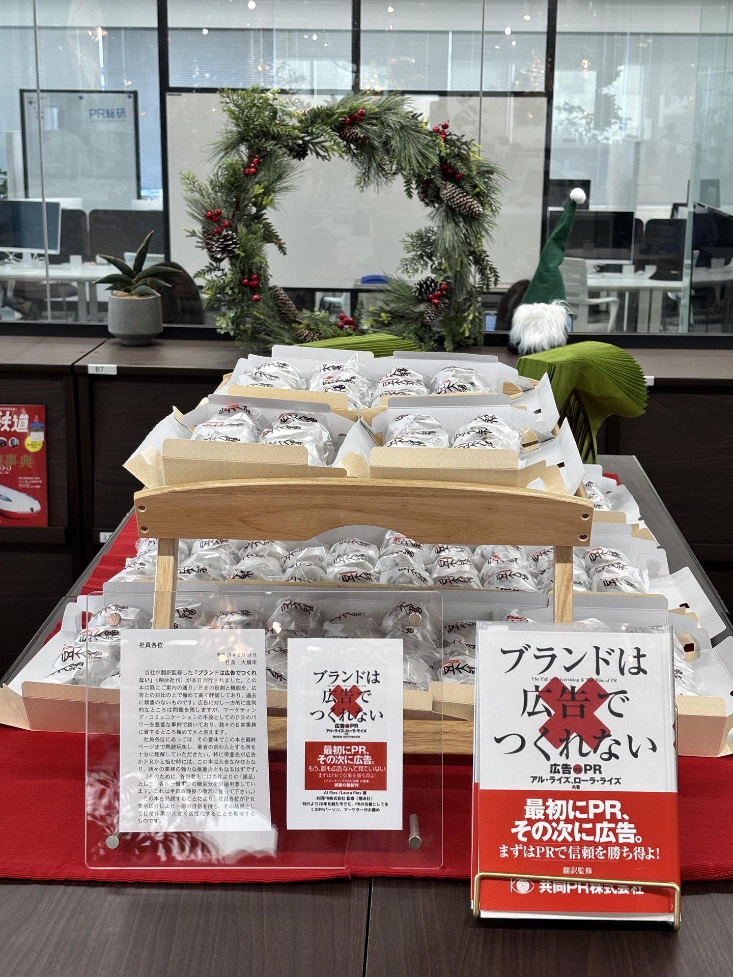↑ 社長から社員へ“大福”の差し入れとともに、創立61周年を祝福。手前の書籍『ブランドは広告でつくれない』と、創業者による「PRパーソンの心得」を示すメッセージカードは、当社の“PRの原点”を象徴するものです。