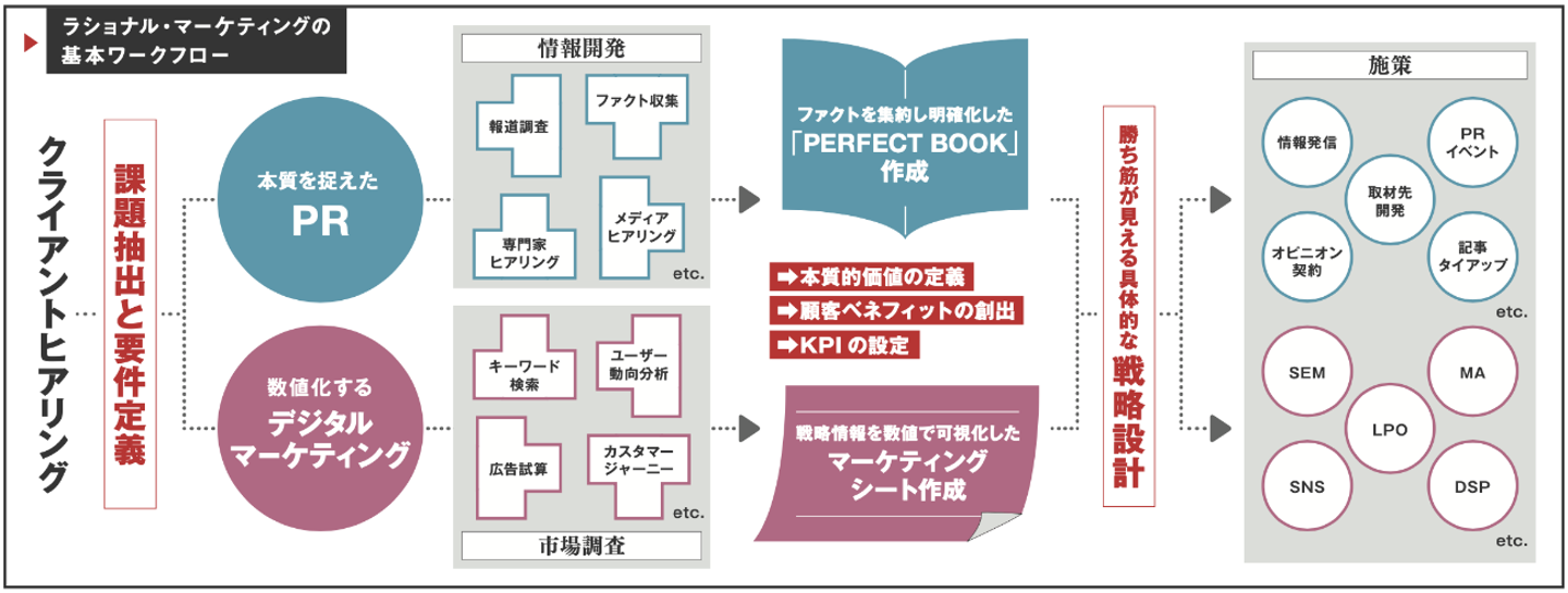 ラショナルマーケティングとは、「戦略PR」による戦略立案に、売上に直結する施策を導き出す「デジタルマーケティング」を掛け合わせて、一気通貫で支援する新しいマーケティング手法です。