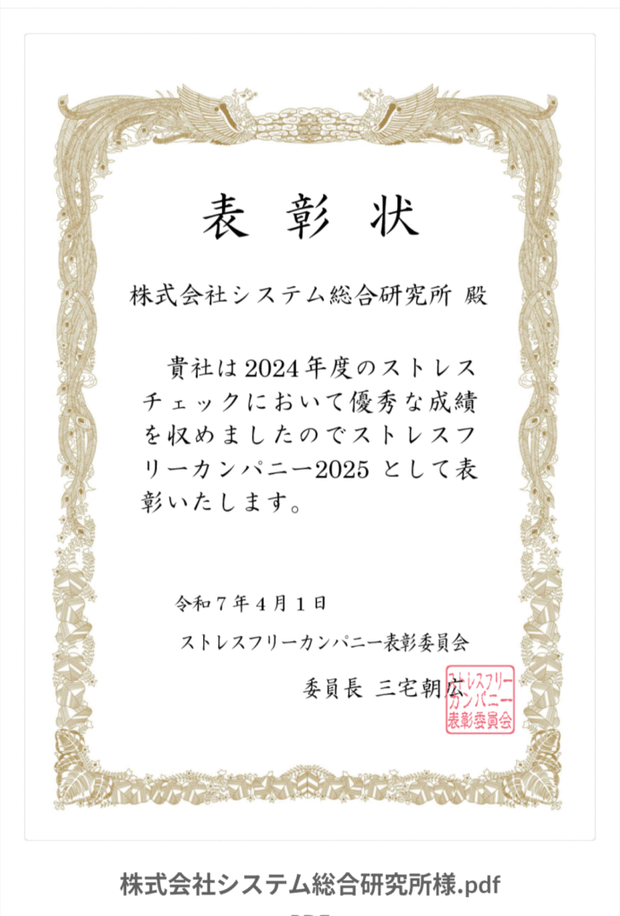 株式会社システム総合研究所Followhttps://www.srinet.co.jp東京都FollowHomeAbout usMembersStoriesJob postings 2025年もストレスフリーカンパニーに選出 井上 真輔, システム 総合研究所 事業推進室, Engineer/programmer 井上 真輔 株式会社システム総合研究所 / 事業推進室 Follow システム 総合研究所 Engineer/programmer Follow on 2025-06-09 ストレスチェッカーのHRデータラボ様から、今年も「ストレスフリーカンパニー」として表彰されましたストレスフリーで健康な日々を過ごしましょう。 株式会社システム総合研究所's job postings 2025年もストレスフリーカンパニーに選出 井上 真輔 株式会社システム総合研究所 / 事業推進室 ストレスフリーカンパニー Share