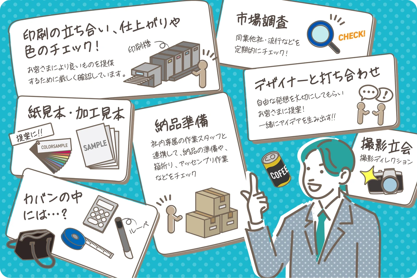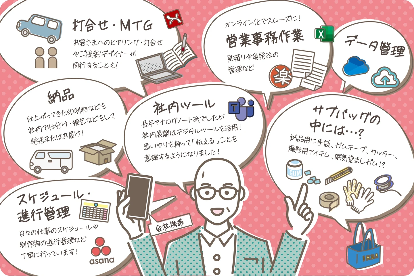 お客様への訪問準備、社内での制作打ち合わせ、急ぎの見積もり作成…やることは多岐にわたります。単なる“商談担当”ではなく、提案から納品管理、時には現場での立ち合いまで、一日の中でいくつもの役割を切り替えながら動きます。