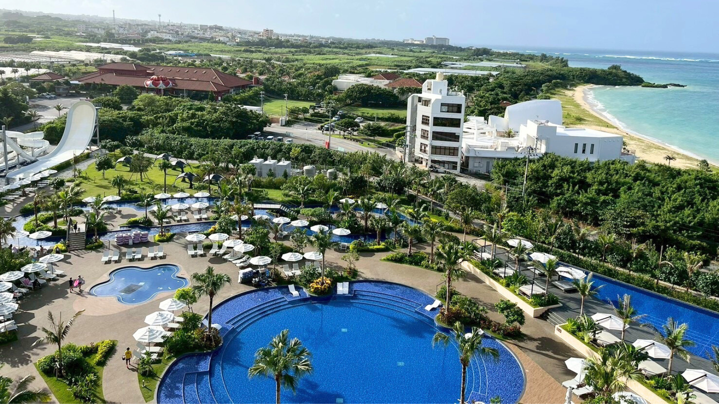 10時に到着した頃は大雨でしたが、ホテル到着時には回復。宿泊先はなんとプールとウォータースライダー付き!