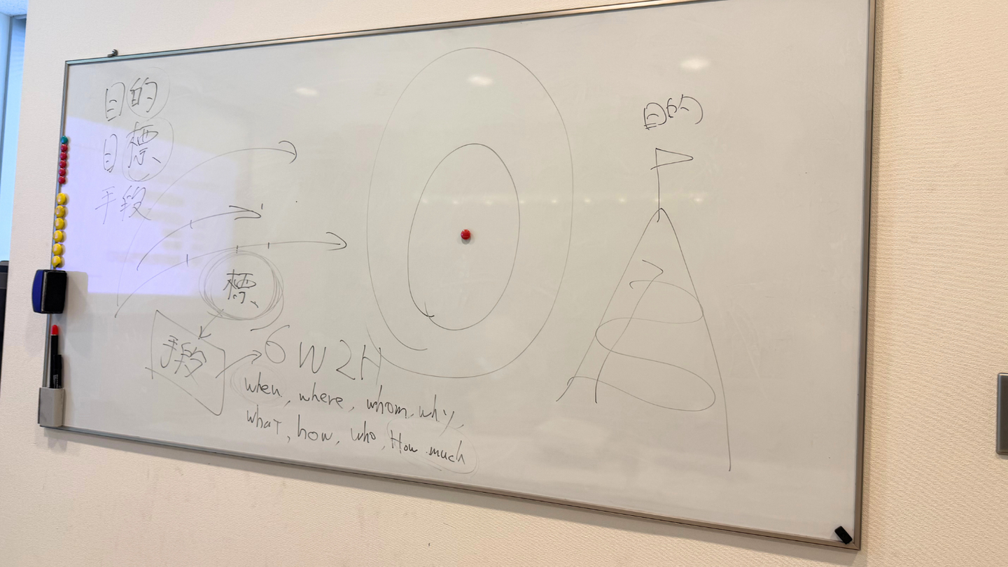 特に印象に残ったのは、この目的と目標の違いについての説明。「目的は円の中心にあって、それを達成するための手段として目標がある。目標を目的にしがち」という指摘は、多くの人が陥りやすい落とし穴だそうです。社員にも聞かせてあげたい!