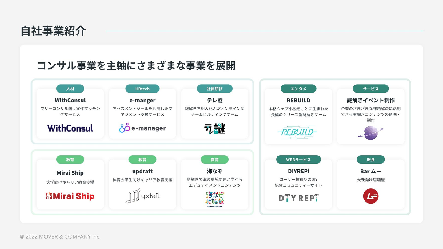 今回はその続きとして、現在のMOVER&COMPANY(以下、ムーバー)、特に主軸のコンサルティング事業部の特徴について、そしてこの先目指していることについて書いていきます。