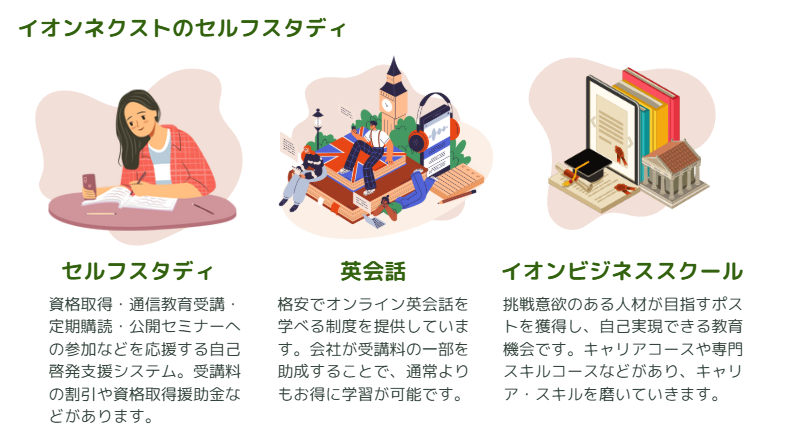 イオンでは「自分のキャリアは自分で切り拓く」という理念のもと、様々な教育機会を提供しています。セルフスタディの支援として、通信講座や資格取得費用の助成、また挑戦意欲のある人材が、目指すポストを獲得するための教育機会もあります。その代表的なものが「イオンビジネススクール(ABS)」です。キャリア開発ができるコースや専門スキルが身につくコースなど様々なコースが用意され、日常業務をしながら約1年間かけて学ぶことができます。また新入社員向けにはオンボーディングプログラムを提供し、スムーズな職場適応をサポート。社員向けオンライン英会話は、会社から受講料の一部が助成され、通常よりもお得に学習が可能です。