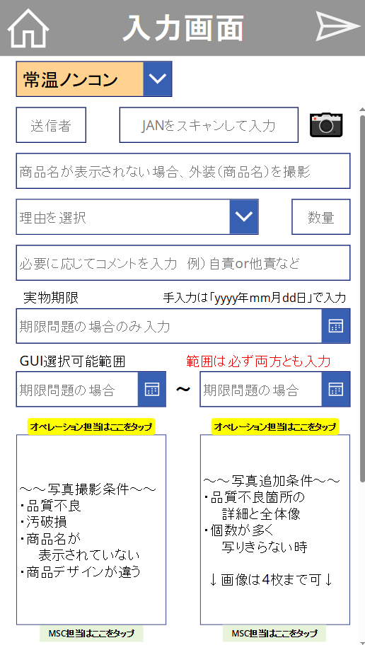 入荷した商品に問題があった場合、イオンネクストではこれまで「不適合報告」として紙の帳票に手で商品名、JANコード、不適合の内容などを記載し、関係各所に報告を行っていた。しかし手での記入は時間がかかるし、転記ミスも頻発する。そこでCFCのスタッフが「不適合報告アプリ」をPower Appsで自作。商品に貼られたJANコードをスキャンし、不適合内容を選択するだけで、正確に報告ができるようになった。入力時間は短縮され、関連部門にも自動的に情報が共有される。