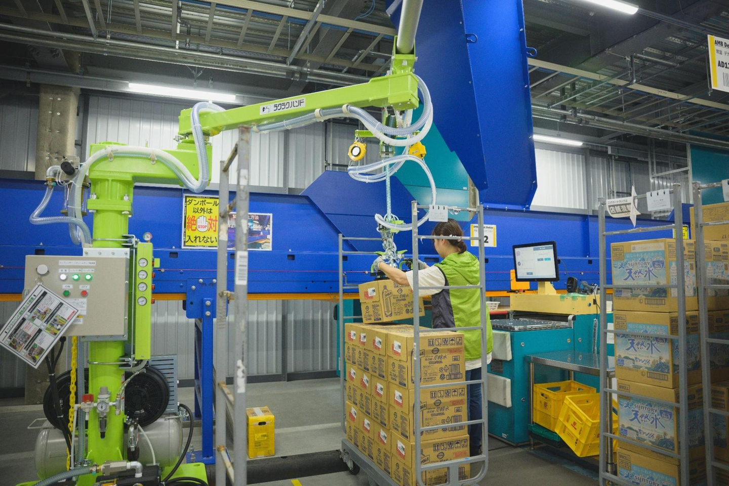 ネットスーパーではペットボトル飲料のように重量がある商品の人気が高い。そのため、たとえば1箱12kgあるペットボトルの水を1日に何百ケースも入荷・棚入れするという重労働も発生する。そこで現場の入荷担当の作業を軽減するため、CFCオペレーション部は「バキュームリフター」という、吸着によって重量物を扱いやすくする作業機器の導入を決定した。