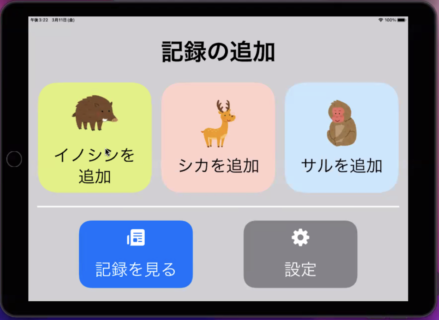 愛媛大学の武山絵美教授と協働開発したiPadアプリです。農作物を食べるイノシシやシカの害獣問題を解決するためのものです。捕獲者の皆さんがイノシシやシカを捕獲した際には、自治体への報告が必要になるのですが、その一連の流れをデジタル化するシステムを開発しました。