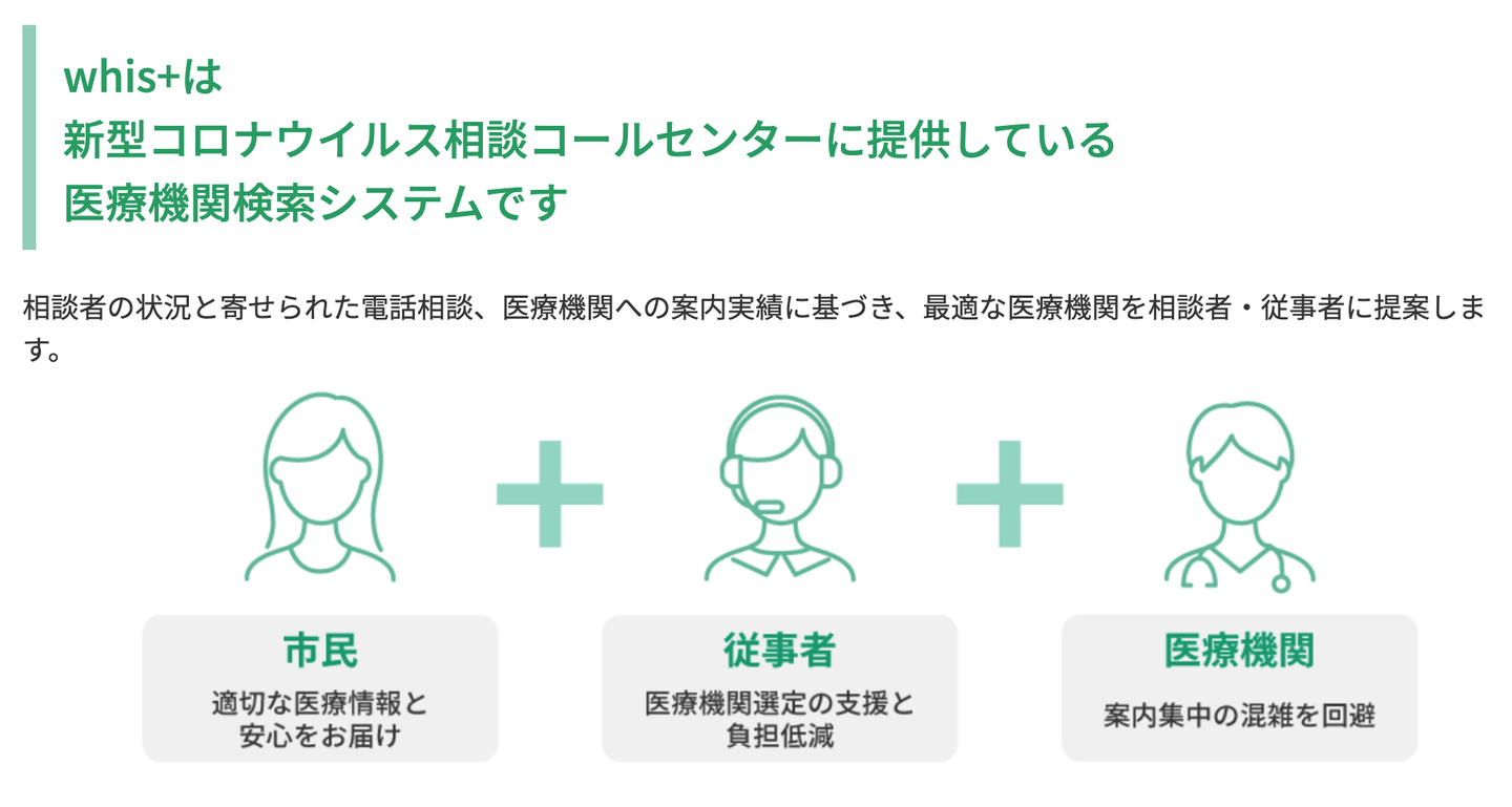 最初にメインで担当したのが自社プロダクト「whis+」の開発です。仙台市の医療コールセンター向けのアプリケーションで、問い合わせに対して最適な医療機関を提案することができます。プロジェクトの立ち上げフェーズからアサインされ、当初はシステム開発を担っていたのですが、自分の適性を見ながら、企画やビジネスサイドに徐々に役割をシフトしていきました。