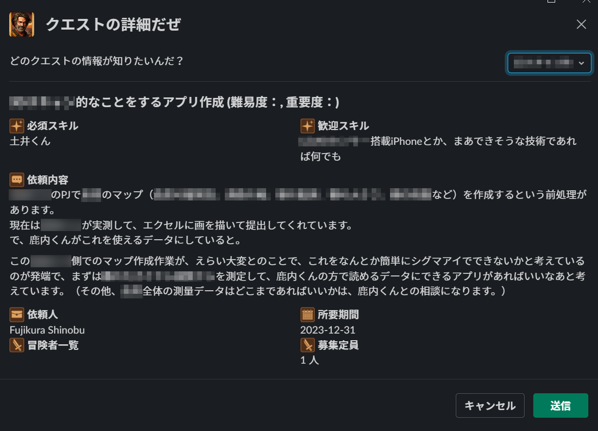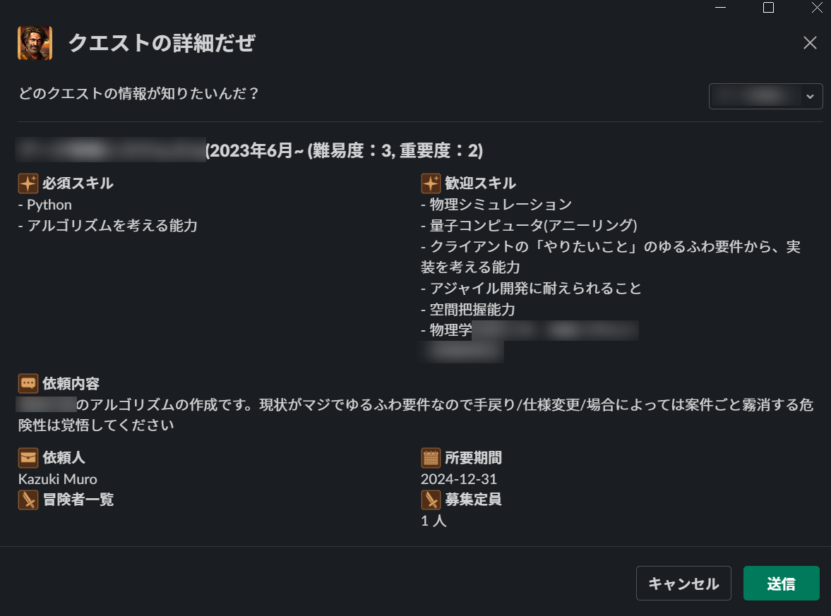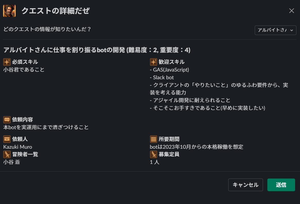 こちらのSlackチャンネルに、社員から「仕事の依頼=クエスト」を投稿してもらう仕組みです。これらの中からアルバイトが挑戦したいものを選びます。その後は依頼者とアルバイトの間で細かいやり取りを行い、作業をスタート。作業が終わったら、依頼者がフィードバックを書き込むことで、クエストが完了になります。毎月末がフィードバックの期限で、依頼者に自動的にプッシュ通知が飛びます。