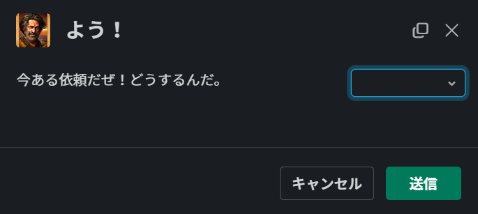 この世界観にはかなりこだわりました。社内デザイナーの山本あずささんにガッツリ入ってもらいました。この「ギルドマスター」のイラストは、生成AIによって作成したいと聞いています。また、セリフにものキャラクターを反映しています。「今ある依頼だぜ!どうするんだ!」みたいな(笑 )。