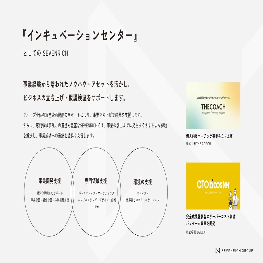 とはいえ、事業開発支援や事業づくりを行う企業はセブンリッチ以外にもあります。他社との違いやセブンリッチならではの特徴とはどんなところにあるのでしょう?