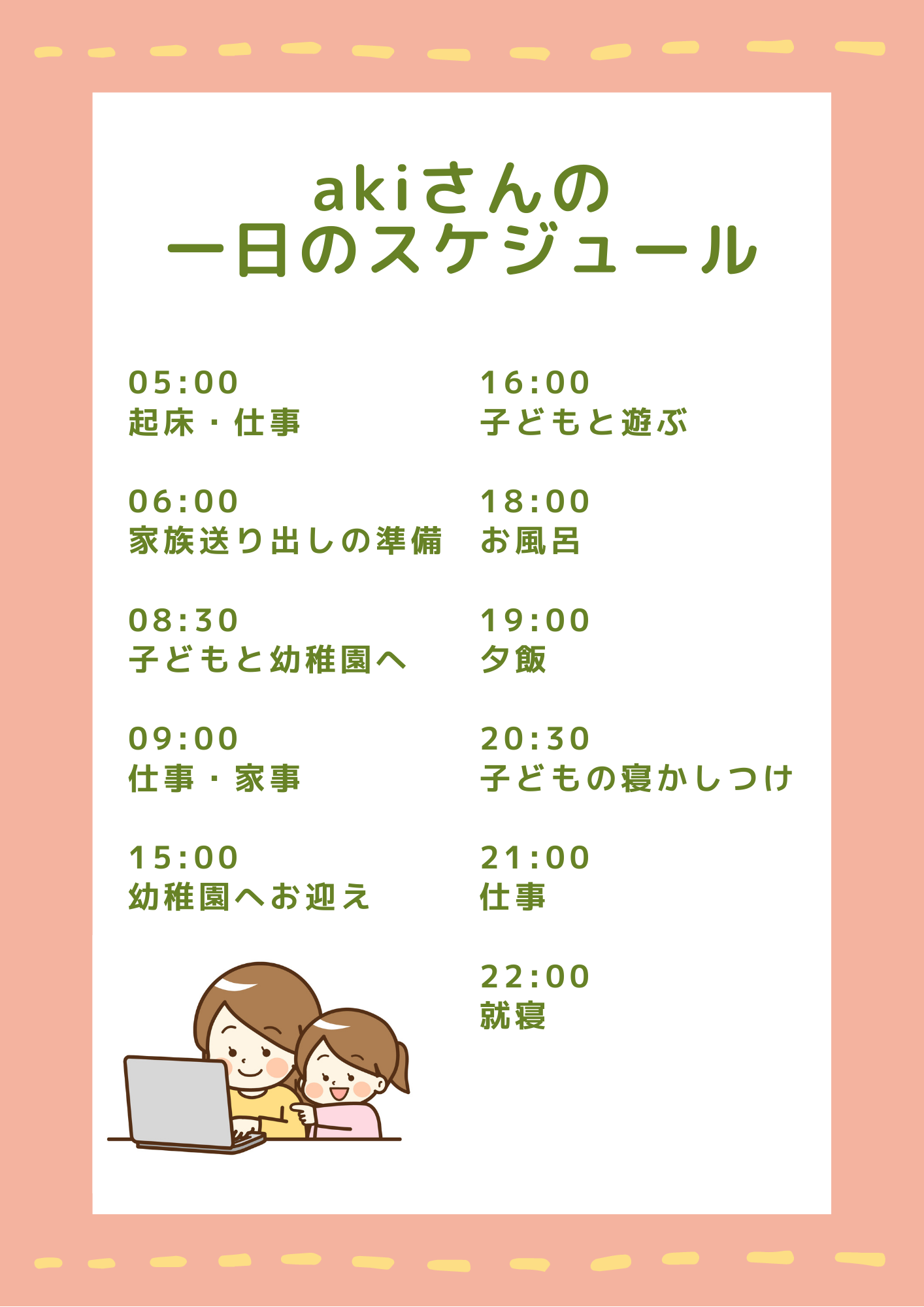 朝早い時は、5時に起きて仕事をしていますね。仕事量は大体一日の稼働時間が2,3時間で、締め切りがある時は夜頑張って5時間程しています。そのなかで、子どもが1歳の時は夜泣きで大変でしたね…(泣)