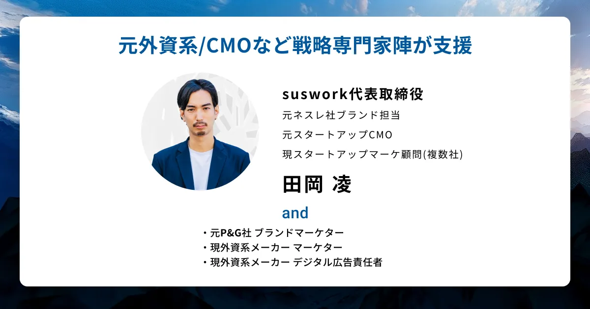 suswork株式会社は、外資系メガブランドで活躍したマーケティングの専門家が多数在籍する戦略マーケティングファームです。マーケティング戦略の立案・実装を通じて、スタートアップや大企業の事業のさらなる可能性を拓き、飛躍的な成長実現に貢献します。