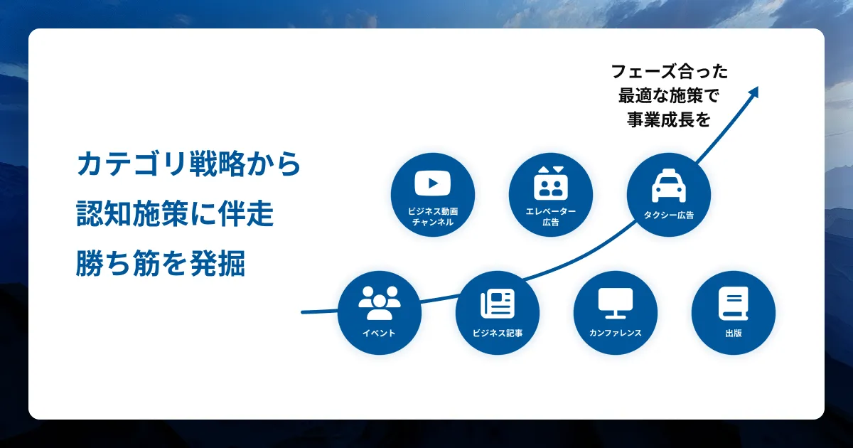 タクシー広告、ビジネス動画チャンネル、ビジネス記事、カンファレンス、出版などに伴走。