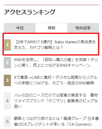 マーケター・経営者向けマーケティング専門誌『MarkeZine』サイトにて、株式会社Sales Marker代表・小笠原さんと弊社代表・田岡のインタビュー記事がアクセスランキング月間1位になりました。(※2024年6月20日時点)