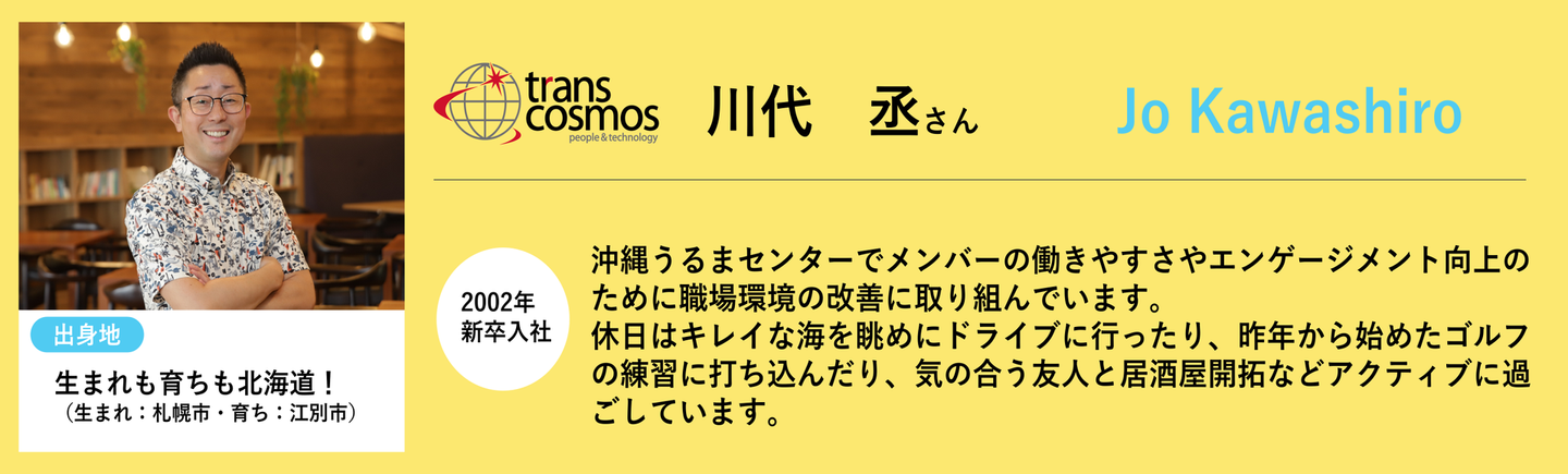 川代さんとお話する中で「現地常駐の強みとして、日々各チームの雰囲気や一人ひとりの表情を気にかけ、変化に対しリアルタイムで対応しています。」とコメントをいただいたのがとても印象的でした。300名という人数は一つの会社ができてしまうくらいの規模ですが、そんな環境でも一人ひとりの様子を気にかけてくださるのは、とても心強いですよね。私もまた沖縄うるまセンターに遊びに行きたくなりました👧🐄またやーたい!(訳:またね!)