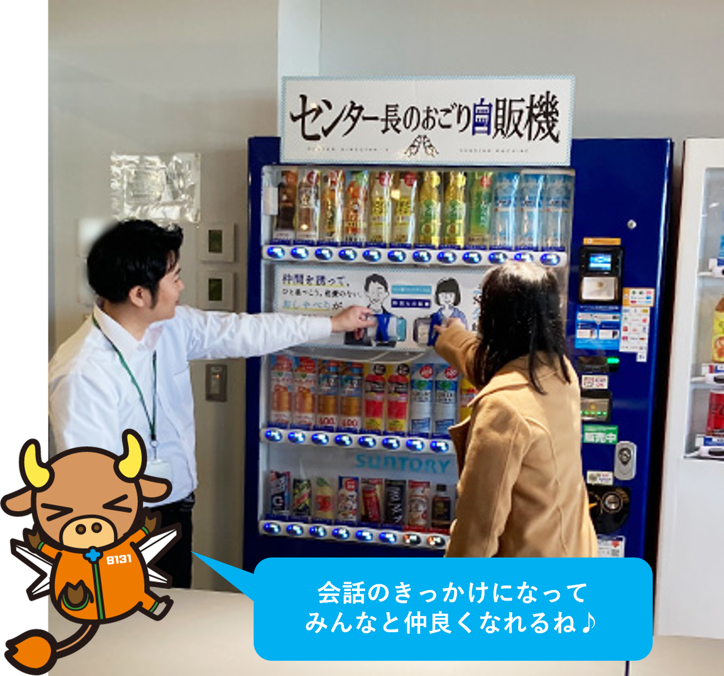 うるまセンターでは社員間のコミュニケーションの活性化を目的とし「おごり自販機」を導入しています。社員2名が同時にカードを自動販売機にかざすと飲み物が会社負担でゲットできるというものです🍹社員に好評な取り組みで、面談時や金曜日にチームみんなで「今週もお疲れ!」という場面で活用されています♩