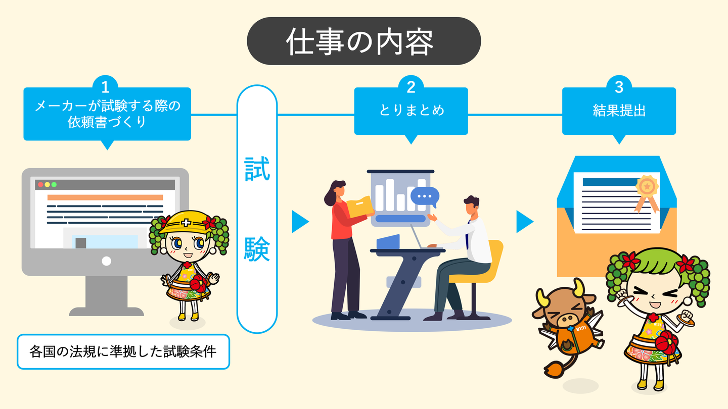 沖縄生活において必要不可欠な車!車のタイヤに溝があるのはご存知でしょうか?なにげなくあるように見える溝でも、耐久性含むドライバーの安全性、含有成分の環境への安全性などがメーカーや各国の厳しい基準をクリアしているか確認する必要があります。そこで、私たちの出番です!下記の図のように、メーカーが行う試作実験に必要な試験内容を整理し、条件をまとめて試験依頼書として形にするのが、私たちの役割です。