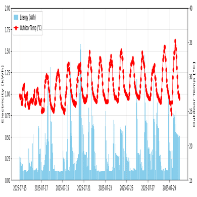 自宅のスマートメーターから取得した電力データを 1時間単位に変換して可視化すると、こんなイメージになります。外気温データについては、気象予報のAPIサービスを活用して取得しました。