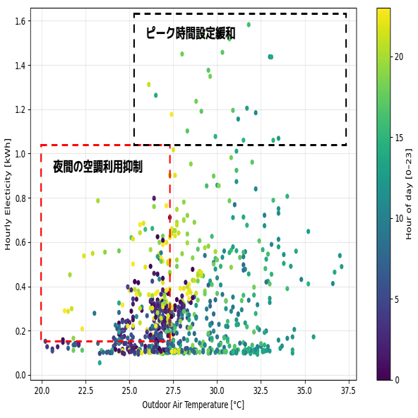 さらに取得データ全体を「外気温に対する1時間あたりの電力使用量」として散布図にすると、次のような傾向が見えてきます。