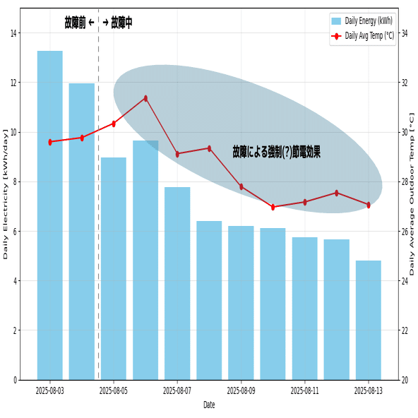故障中でも外気温が高い日(8月6日)は寝室のエアコンに頼ってたので、節電効果は大きくなかったですね…