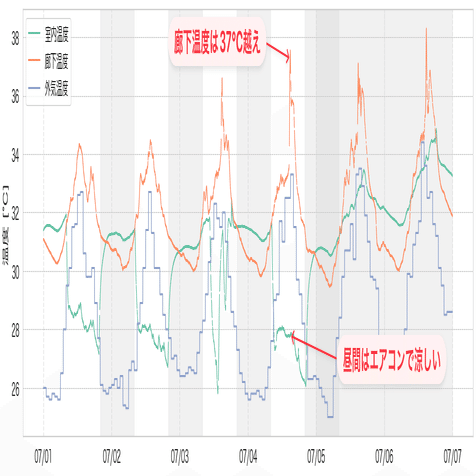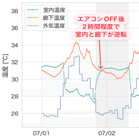 また、建物自体が鉄筋コンクリートで出来ていて昼間の熱を蓄えやすいので、夜間退勤時にエアコンOFFしてから2時間程度で廊下よりオフィス内のほうが暑く、それが翌日まで影響していることもわかりました。