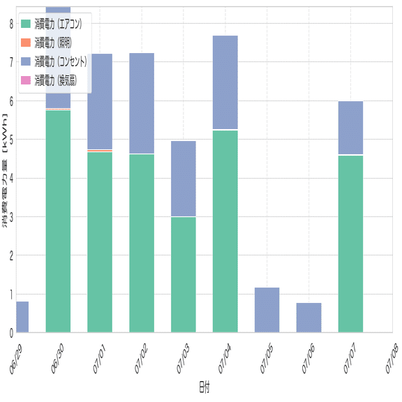 照明もエコなLED照明を使っているので、1日の使っている電力のほとんどがエアコンとコンセント(ノートパソコンなど)からの電力でした。