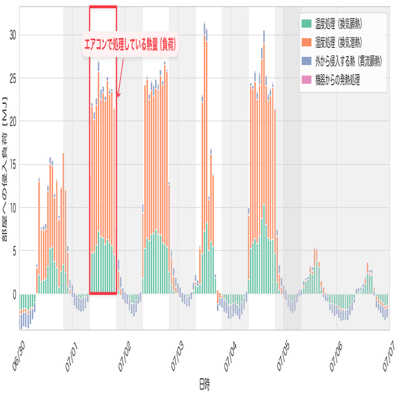 ほとんどが換気によって、外から入る空気の冷房にエアコンが使われている(概算値のため蓄熱や日射の負荷の考慮が少ない点は留意)