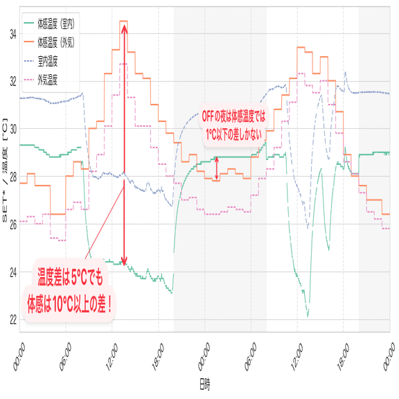グラフをみると、実際の温度差以上に体感温度では涼しく感じていることがよくわかります。
