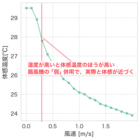 28℃80%の部屋の中で扇風機の風を、だんだん強くした場合の体感温度