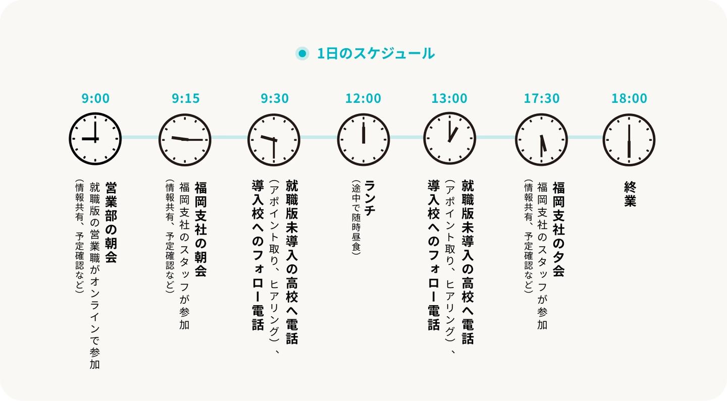 未導入校の先生方に「Handy進路指導室」の特長や導入メリットを電話でお伝えし、商談アポイントをいただく高校向けのインサイドセールスを担当しています。1日にかける電話は70〜80件と多い中、そのうち進路指導の先生とお話しできるのは20件程度です。電話でお話しできた場合は、学校の採用状況やお困りごとについてのヒアリングも行い、その内容やアポイント状況をSlackで共有。その後はフィールドセールス担当が引き継いで、オンライン商談を行う体制となっています。初めての営業職で、最初は不安もありましたが、充実した研修制度で先生方への伝え方や疑問点への答え方をロールプレイングで学んだ結果、1週間後には実際に電話をかけてご説明できるようになりました。