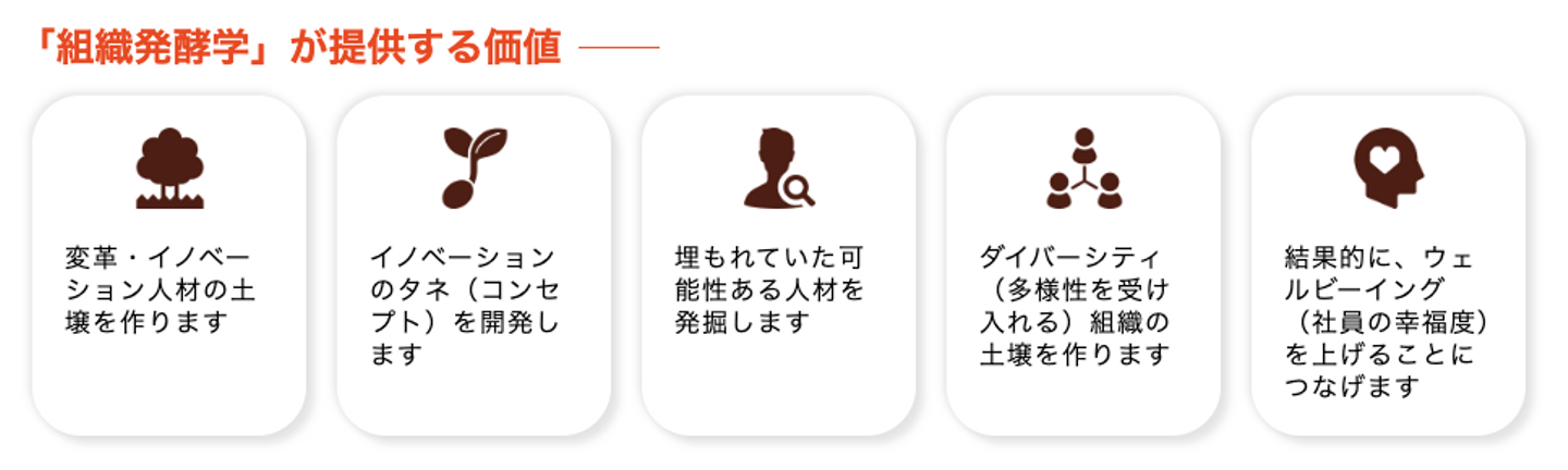 「発酵」の世界から得た知見を基に「人材育成」「組織開発」のソリューションを開発しました。人の捉え方や価値観、内発的動機づけなど「内側にあるもの」を再発見していくことで、人の自律性・多様性・変化への対応力・視座視野を拡げていくプログラムをとなっています。