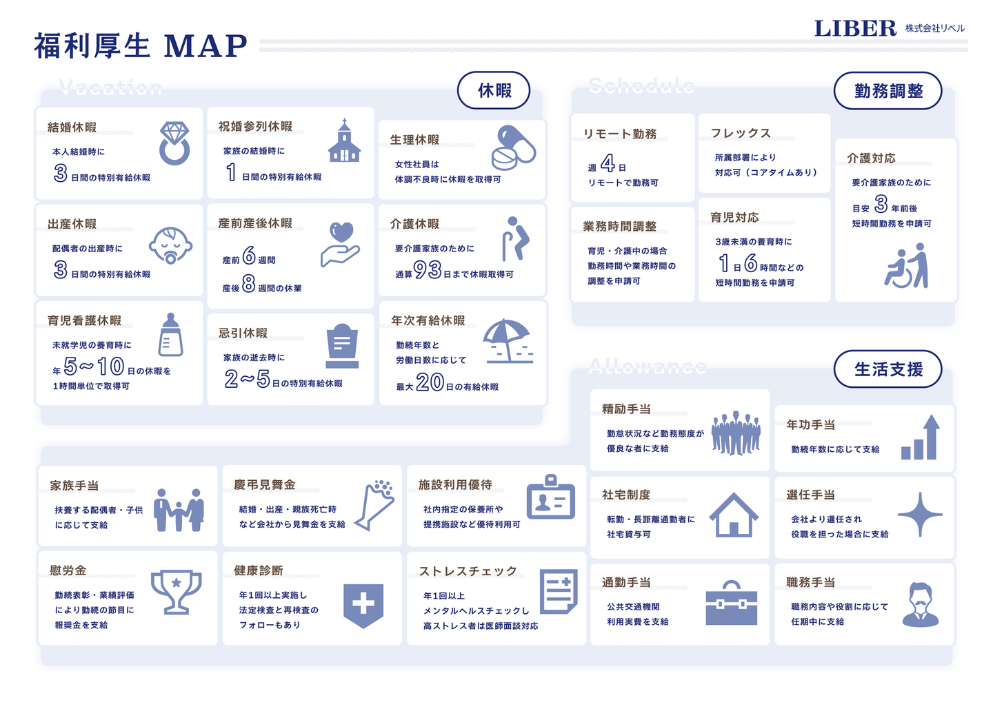 結婚、出産、親族のご逝去など人生の節目に、会社からお見舞金をお届けしています。社員自身だけでなくご家族も含めたセーフティネットをリベルは目指しています!