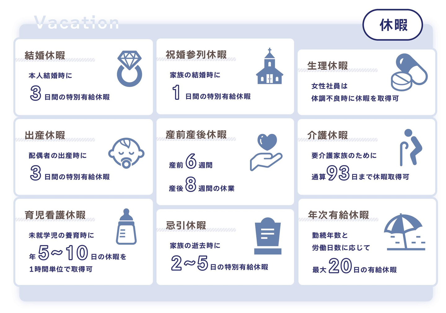 産前6週間・産後8週間の休業が可能です。女性社員が安心して出産・育児に臨めるよう、会社として制度を整えています。