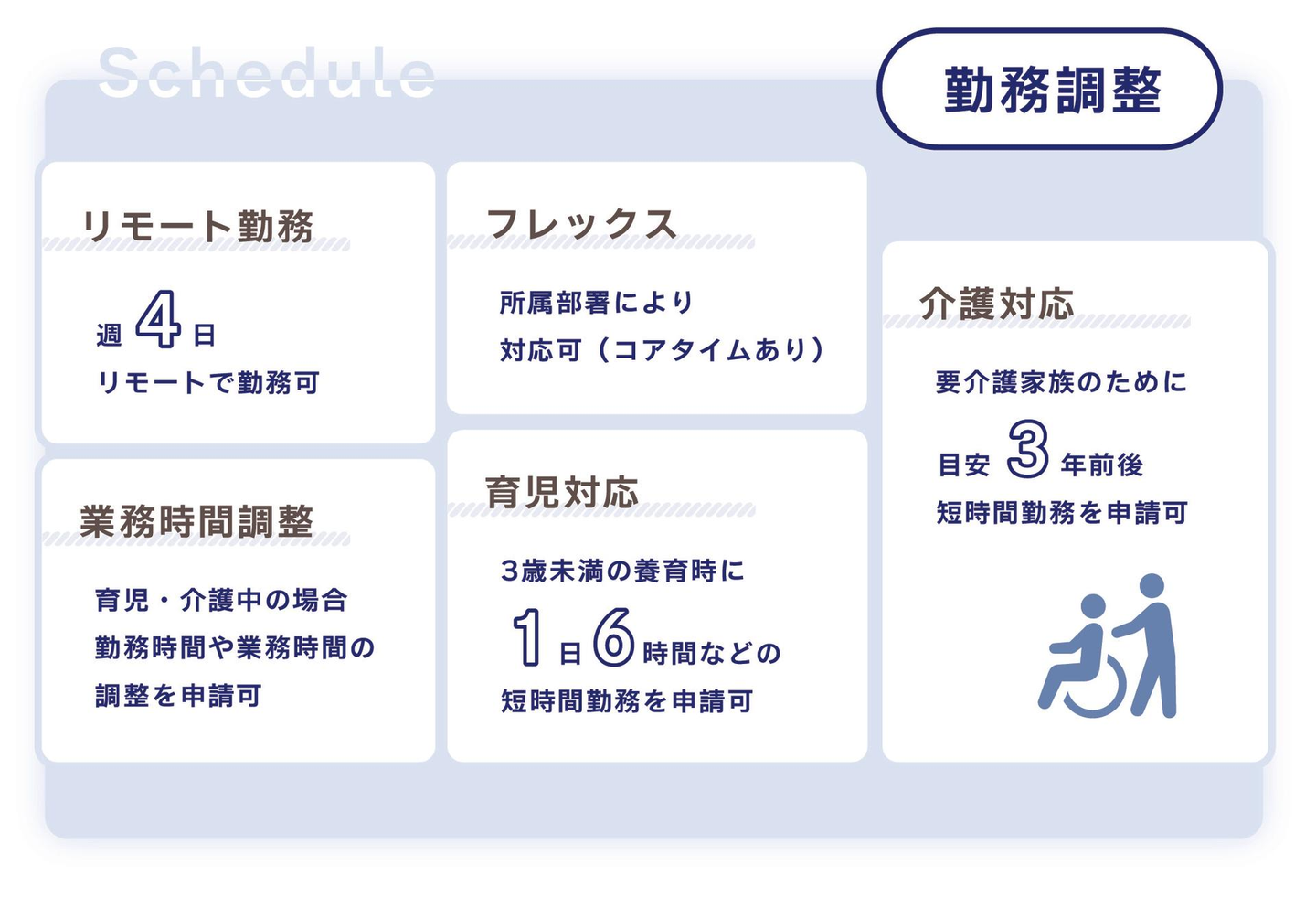 要介護状態のご家族をケアする必要がある場合、通算93日まで取得可能な介護休暇制度があります。家庭の事情により働き方を見直すことができます。