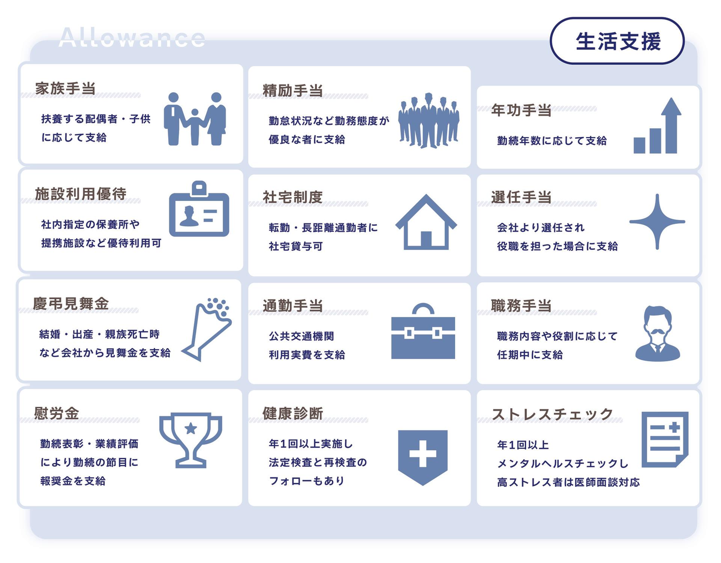 扶養の配偶者やお子さまがいる社員に対して支給があります。家庭をもつ社員の、仕事と家庭の両立をサポートしています。