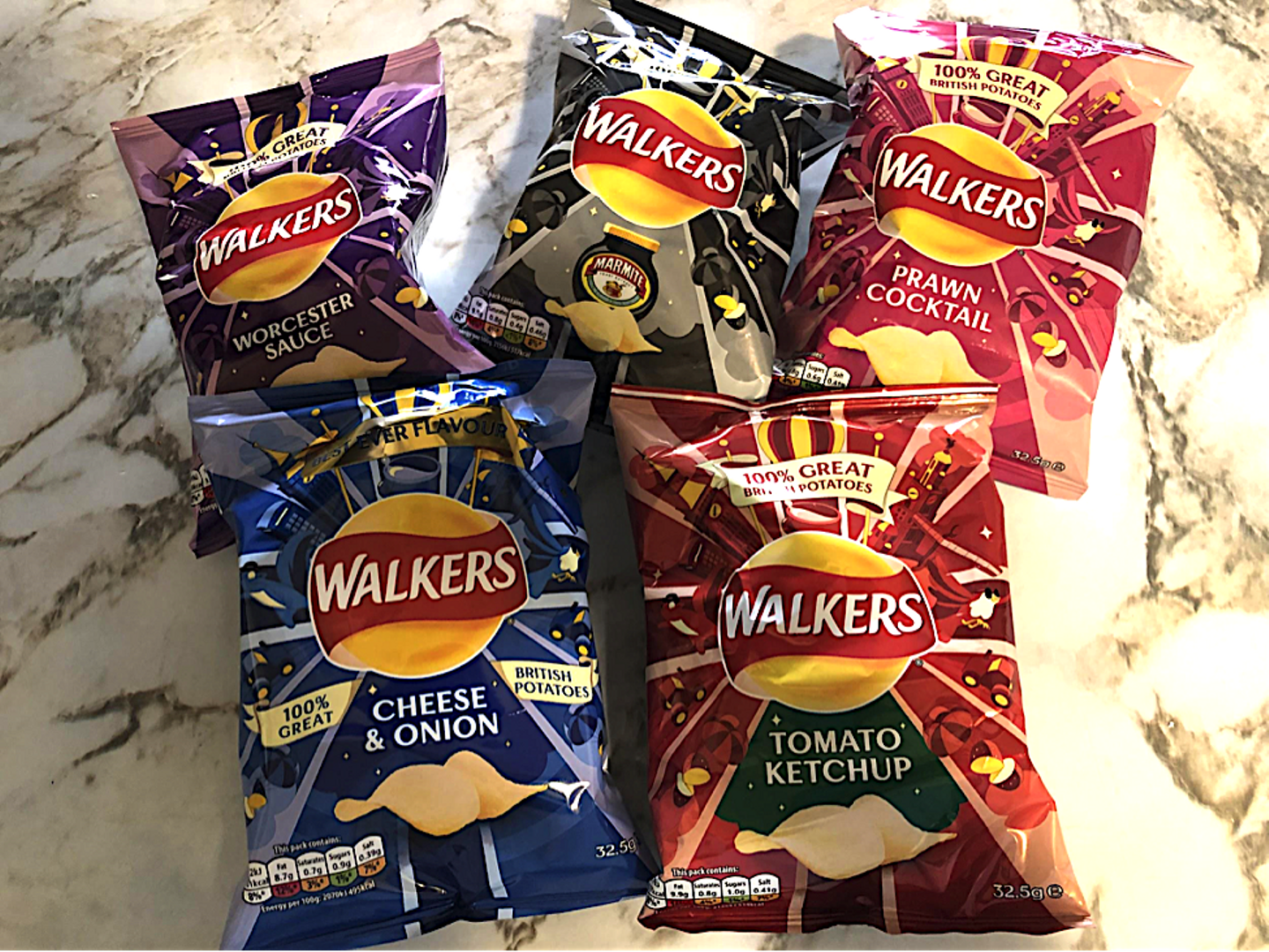 試したことが無いものをピックアップしてみました。左奥からWorcester sauce, Marmite, Prawn cocktail, Cheese and onion, Tomato ketchup。