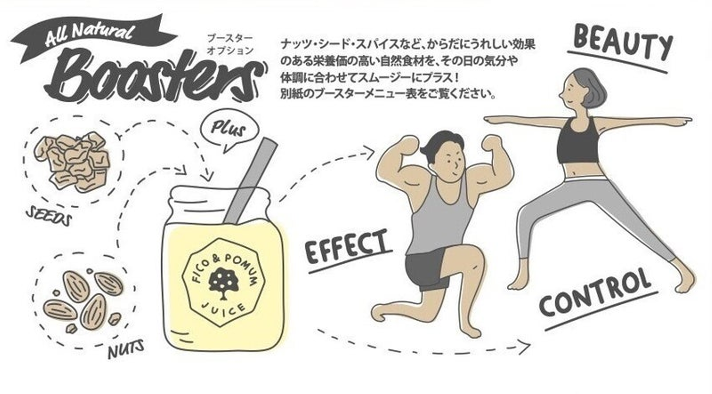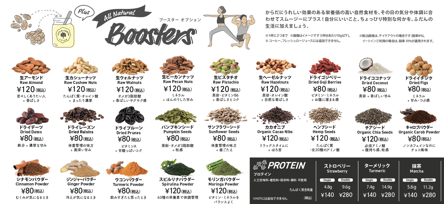 ナッツ・シード・スパイスなど、からだにうれしい効果のある栄養価の高い自然食材を、その日の気分や体調に合わせてスムージーに追加ブレンドできるオプションです。