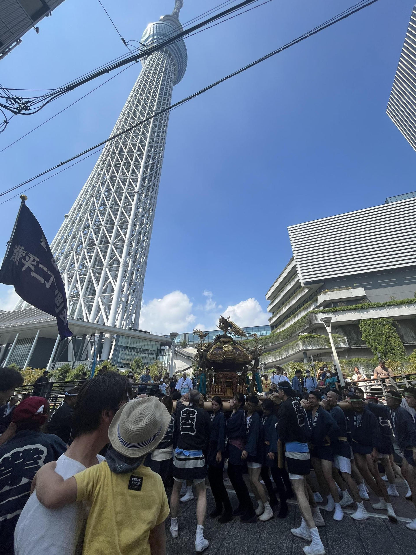 スカイツリーが近すぎて、お神輿をカメラのフレームに収めると、スカイツリーは足元しか写りません。