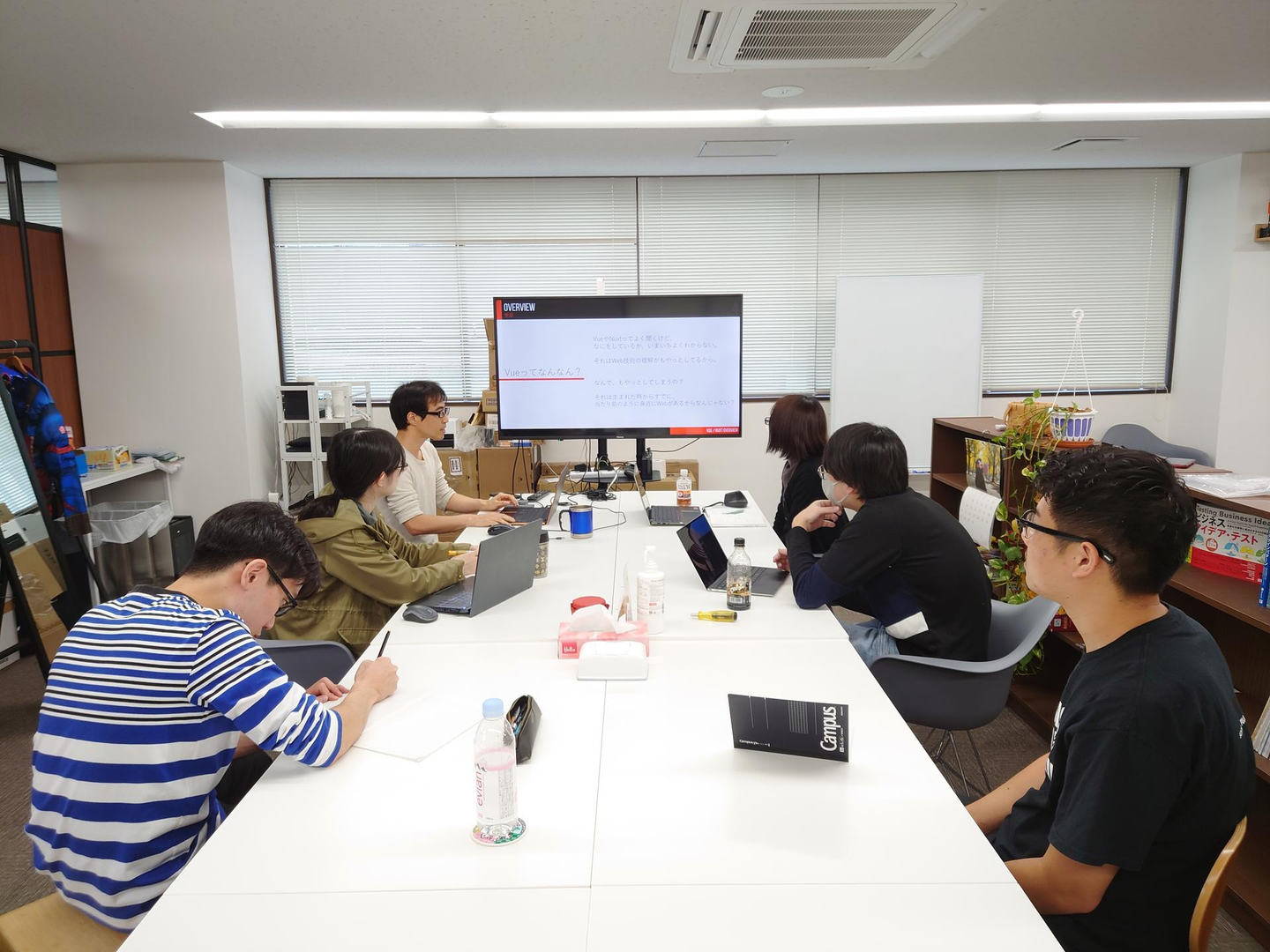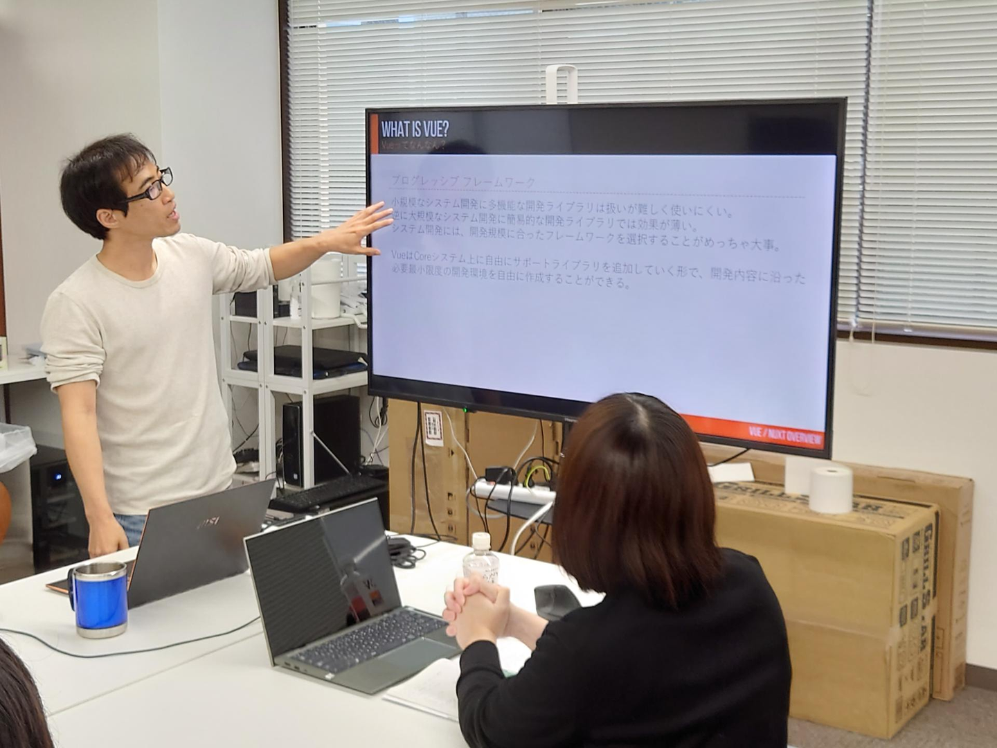 テックリードの役割を持つ取締役の大野が講師となり、Webの歴史から、なぜVue,Nuxtが誕生したのか、Vue,Nuxtのメリット・デメリットなどを講義形式で説明しました。
